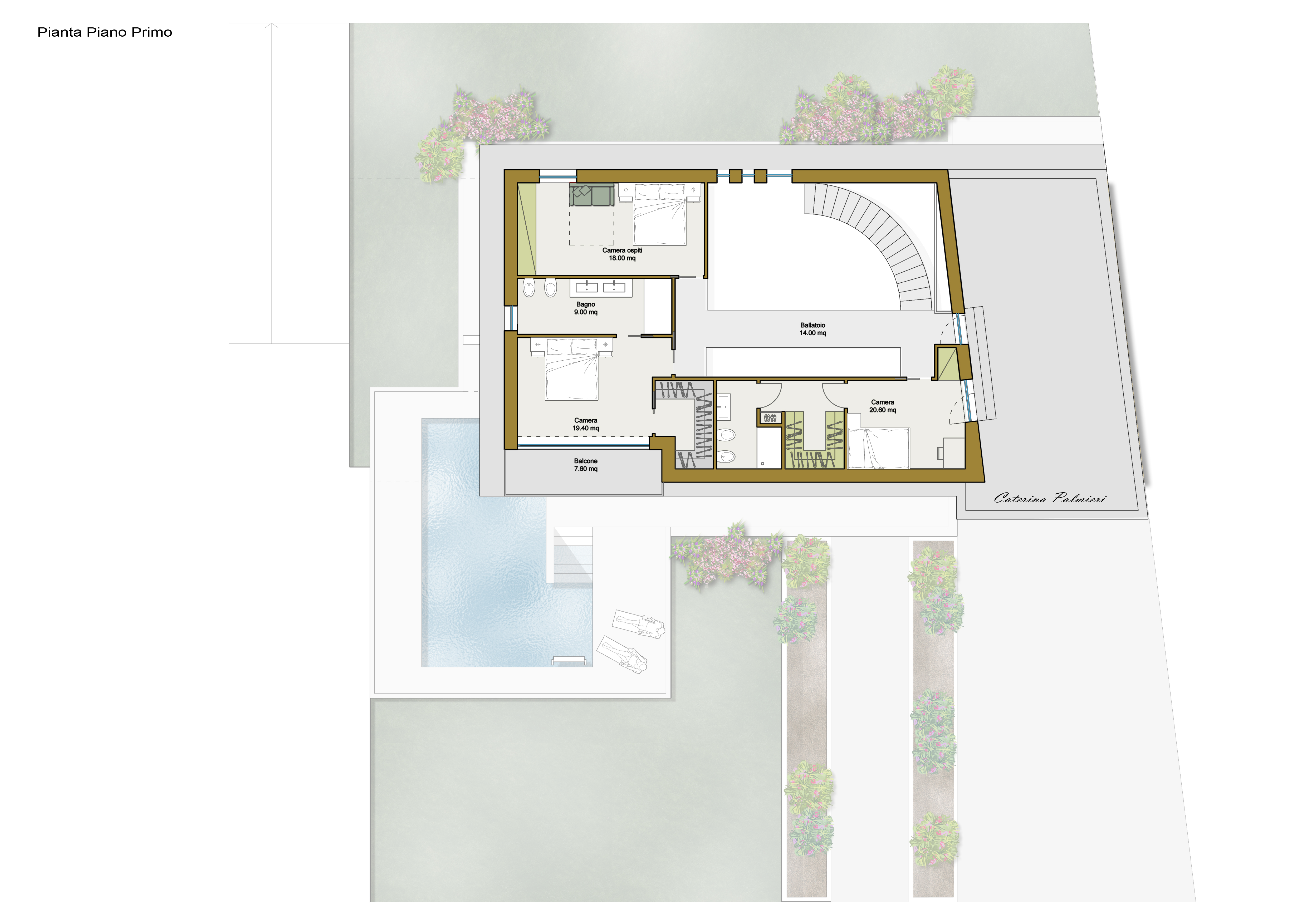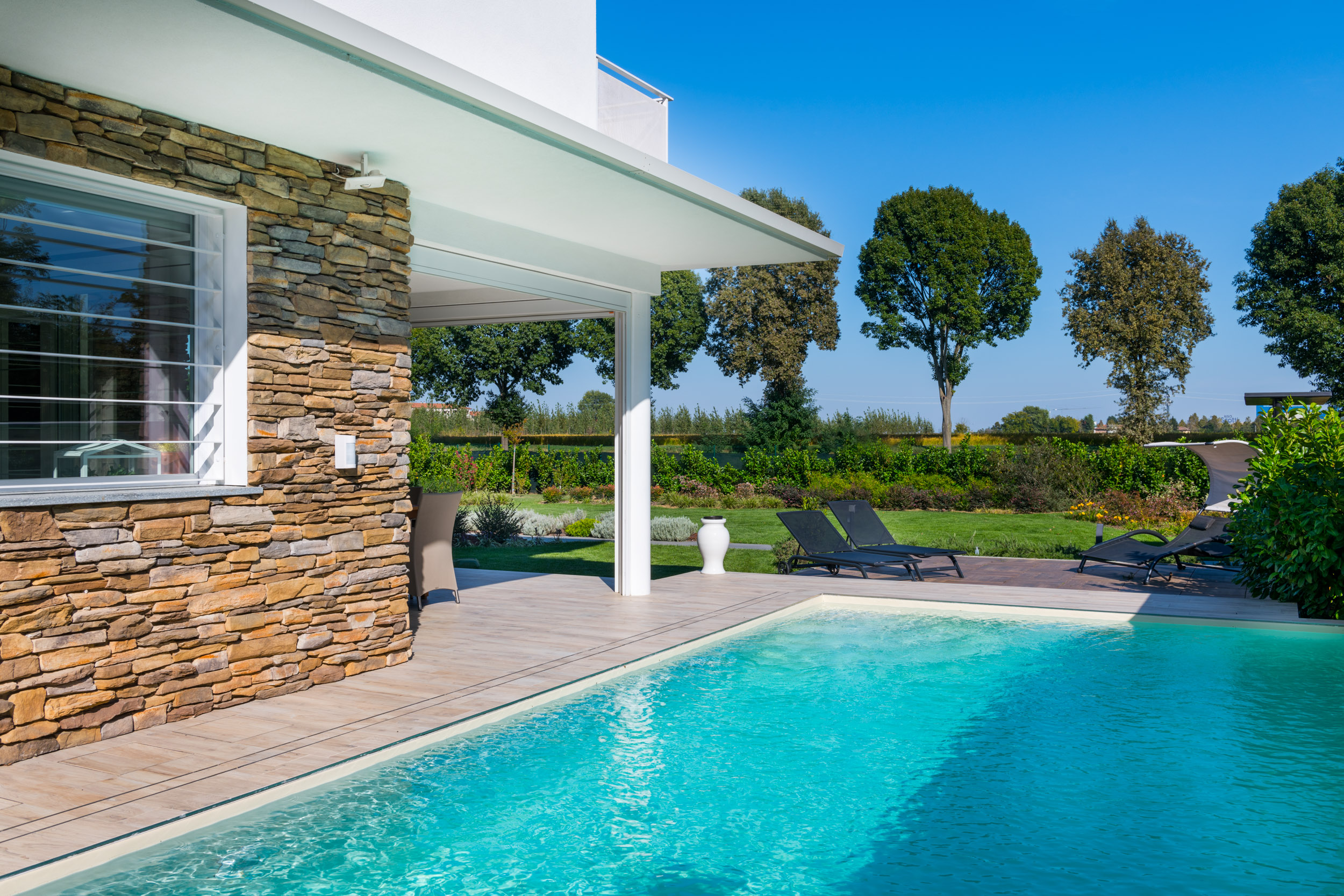 Lo spazio esterno è dominato dal bianco delle pareti e la tinta calda della pietra che vengono riflessi sulla superficie dell’acqua della piscina creando continui rimandi di luce.