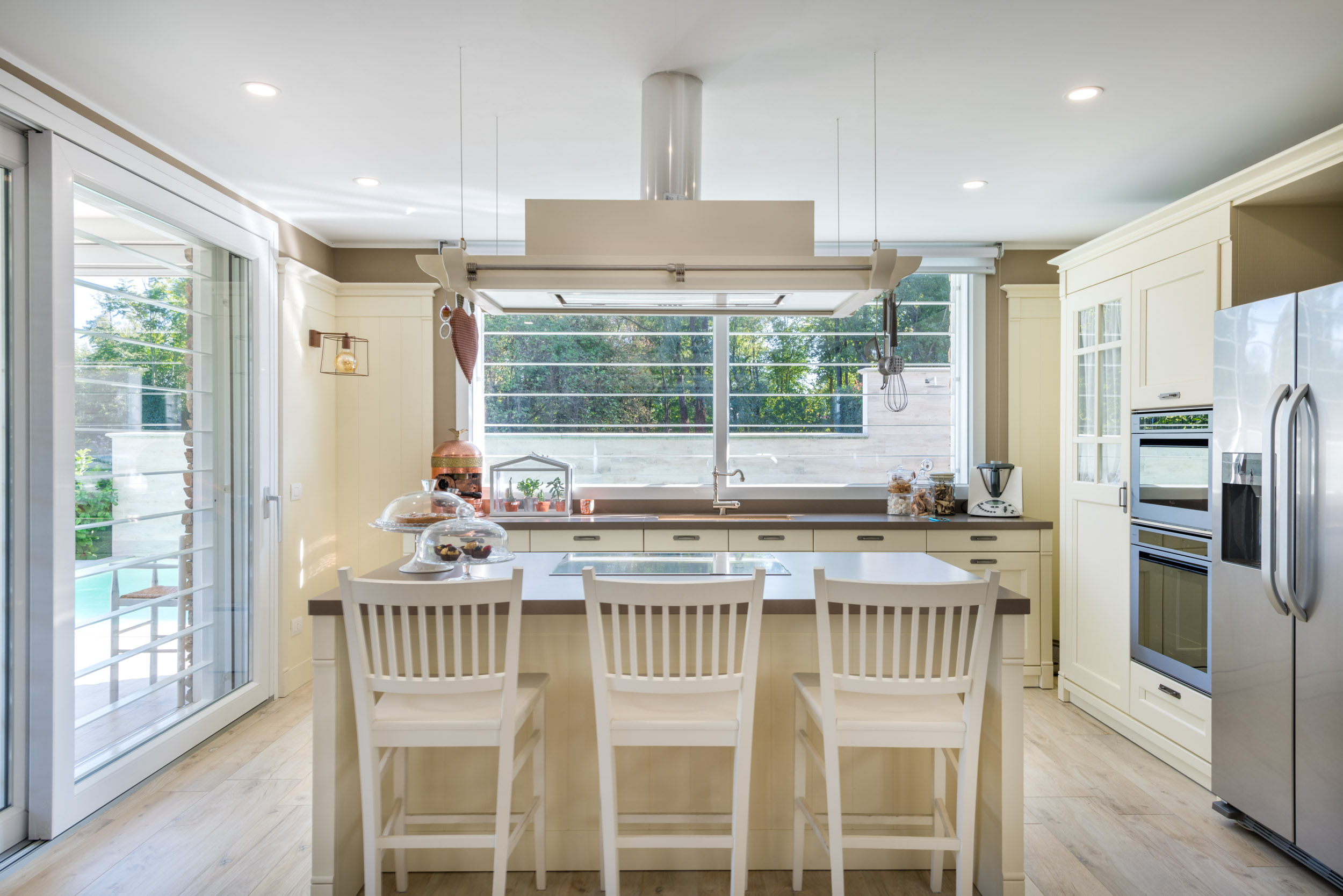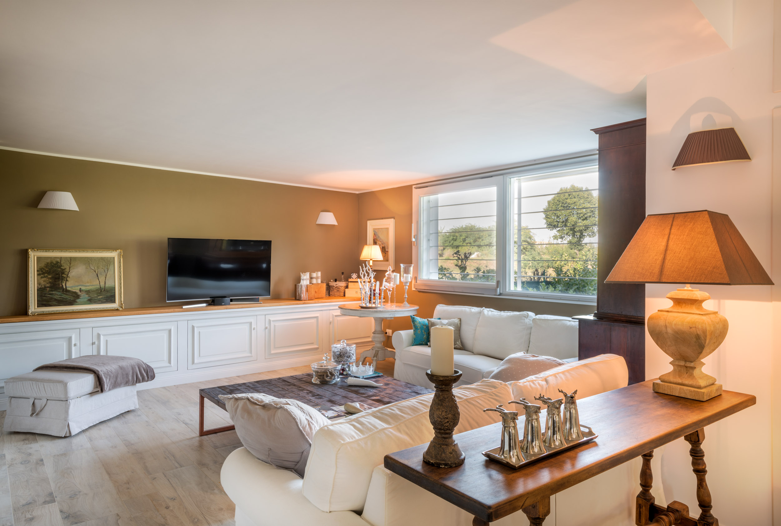 All’interno le forme si addolciscono e il colore bianco lascia spazio al contrasto con i colori caldi e i materiali naturali per creare un ambiente famigliare accogliente.