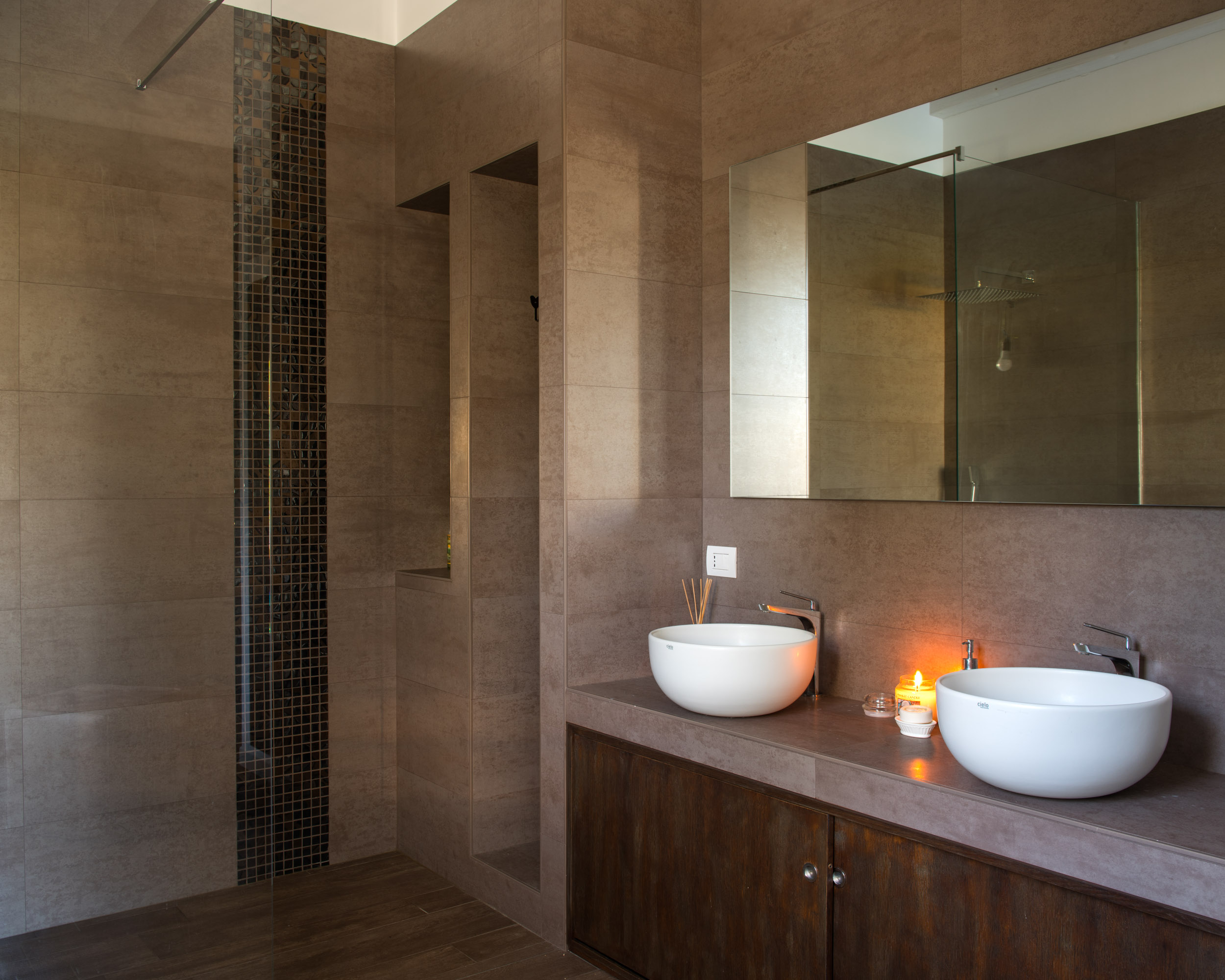 La pietra diviene il trait d’union tra interno ed esterno rivestendo le superfici esterne del piano terra e la parete in accostamento del vano scala all’interno.