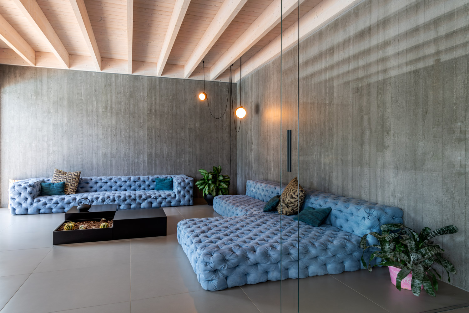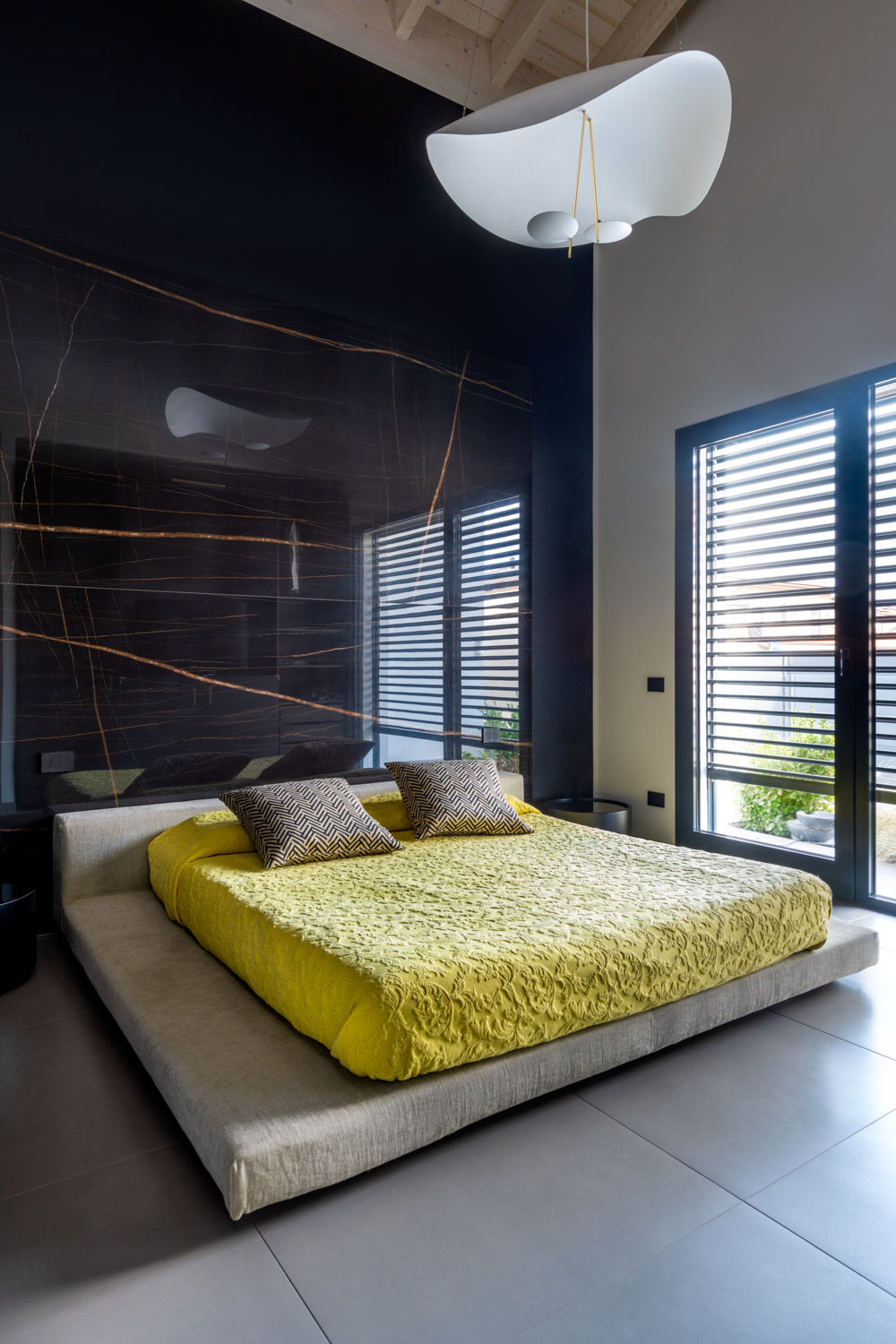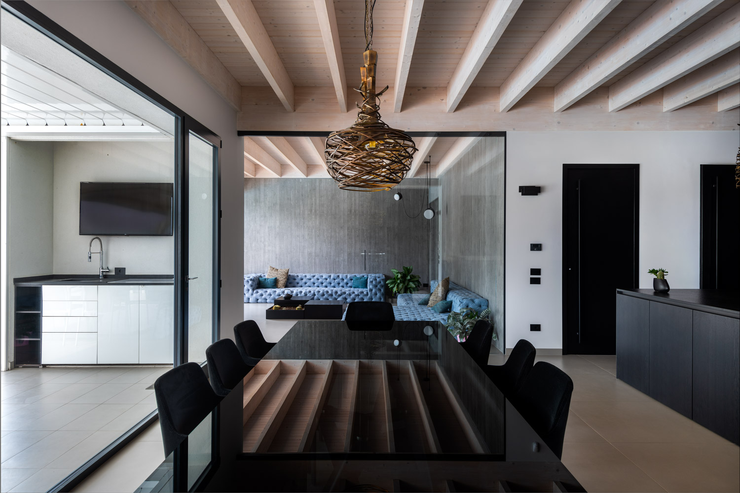 La villa si sviluppa su un unico piano fondendo spazi a doppia altezza con spazi a copertura piana. Gli interni sono lineari e gli arredi studiati per rispecchiare la linearità e la solidità delle linee esterne della villa. Il progetto parte dallo studio egli esterni sino alla progettazione degli arredi. La permeabilità degli ambienti rispetto all’esterno restituisce spazi interni di grandi dimensioni e design moderno .