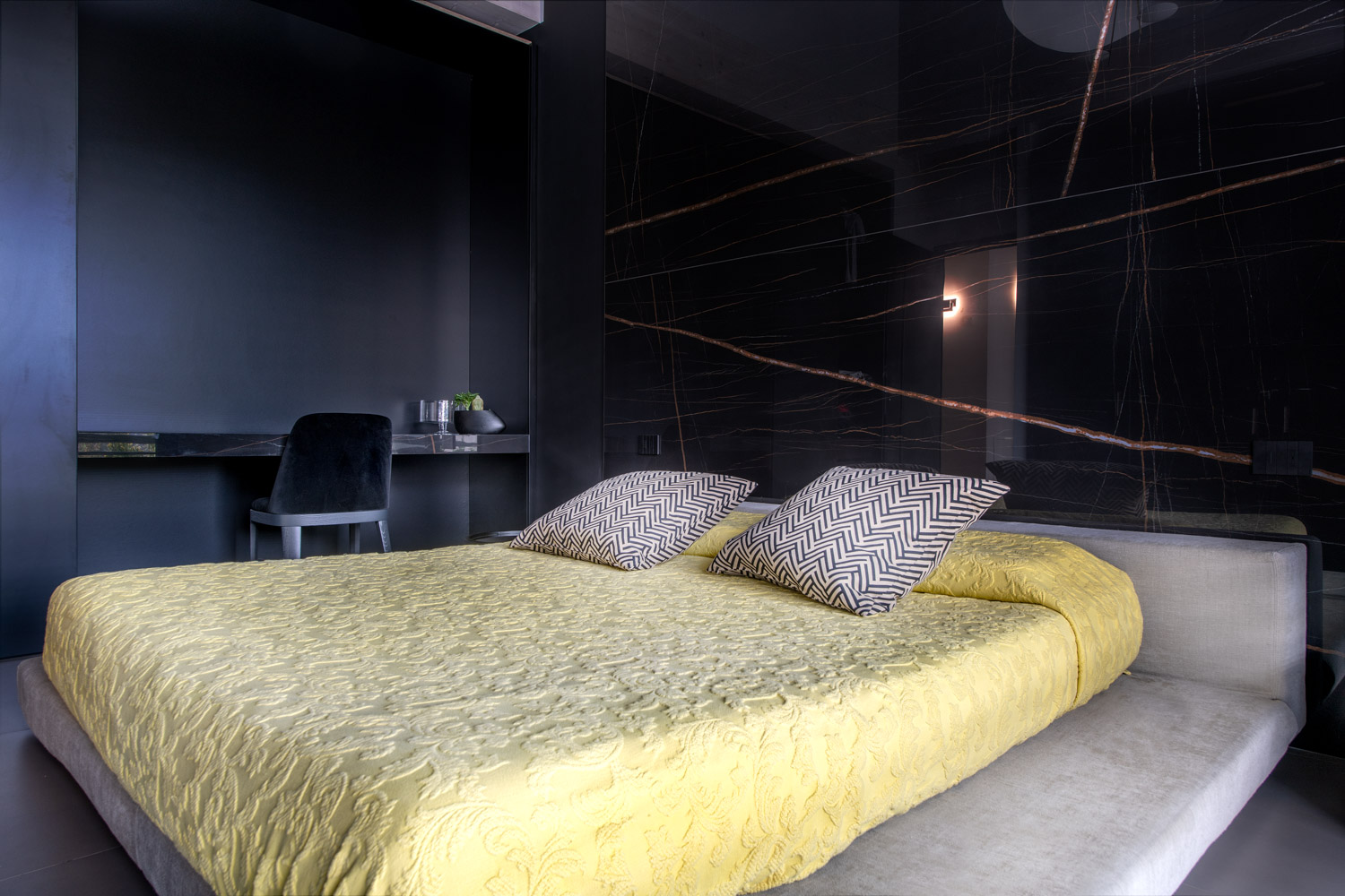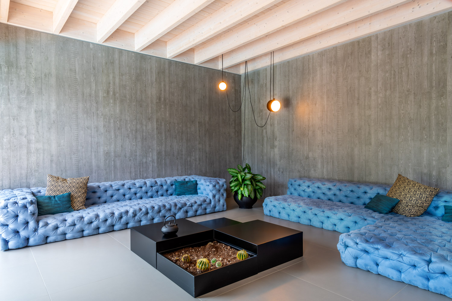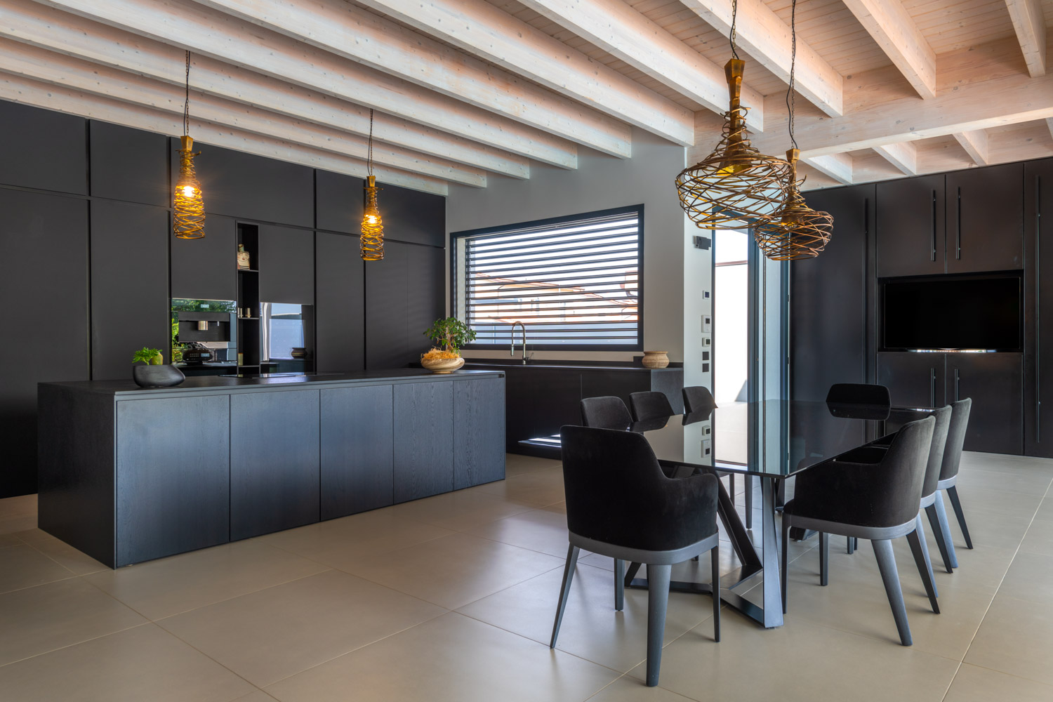 La villa si sviluppa su un unico piano fondendo spazi a doppia altezza con spazi a copertura piana. Gli interni sono lineari e gli arredi studiati per rispecchiare la linearità e la solidità delle linee esterne della villa. Il progetto parte dallo studio egli esterni sino alla progettazione degli arredi. La permeabilità degli ambienti rispetto all’esterno restituisce spazi interni di grandi dimensioni e design moderno .