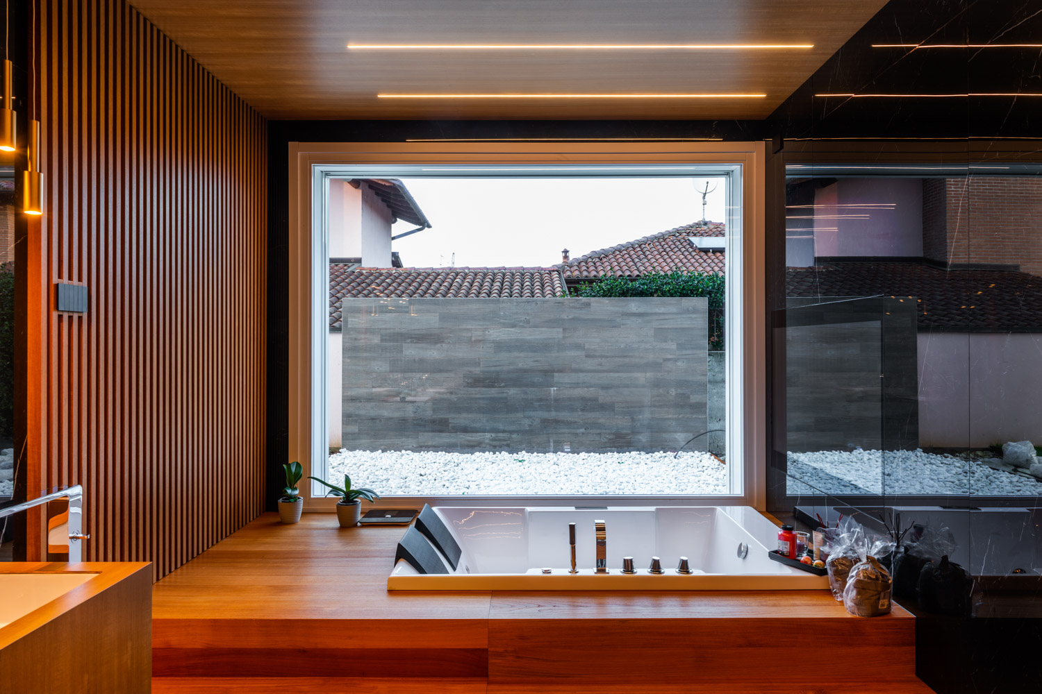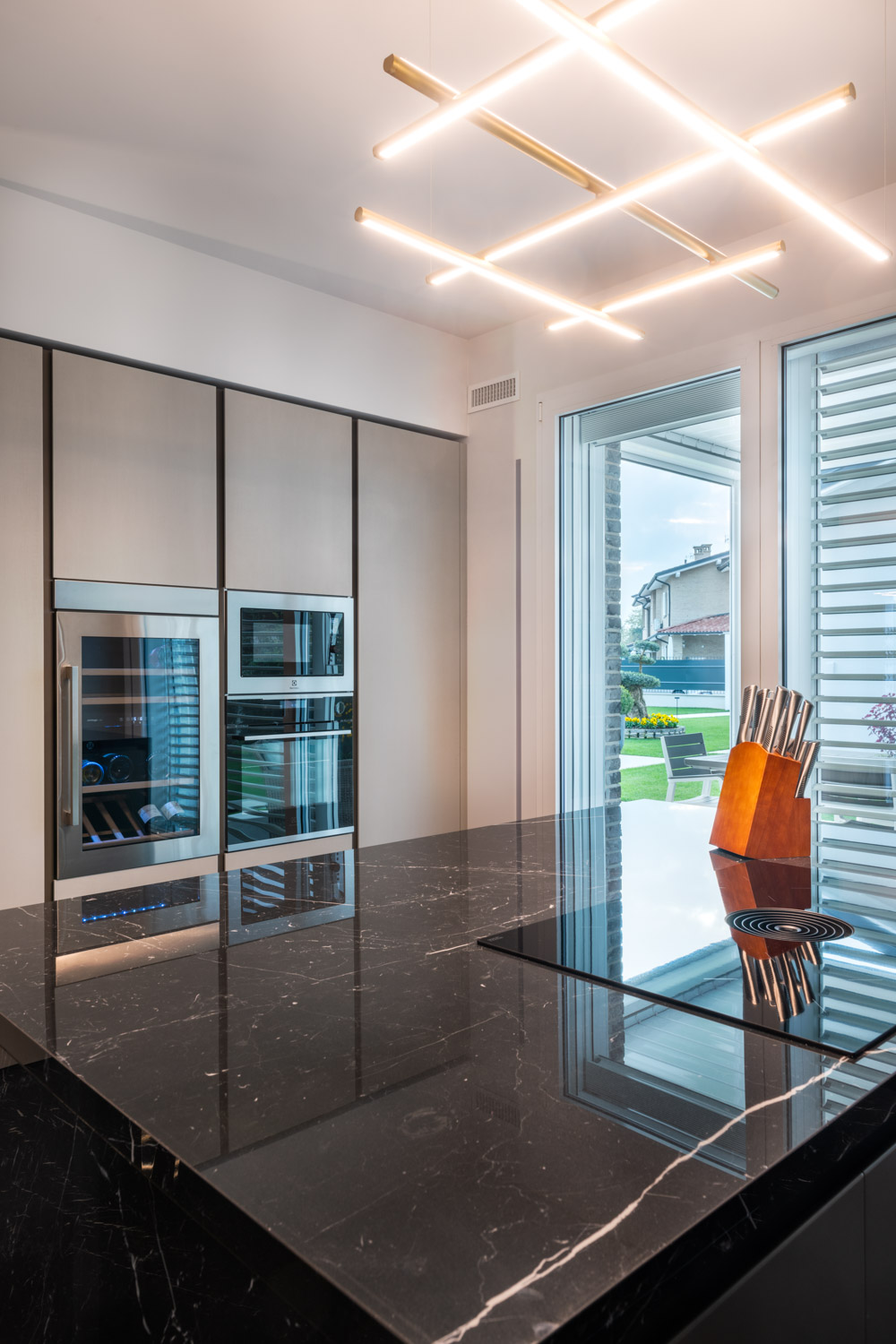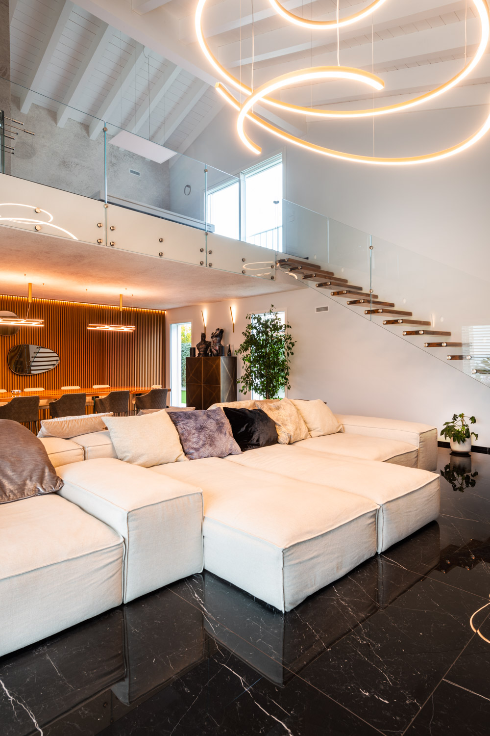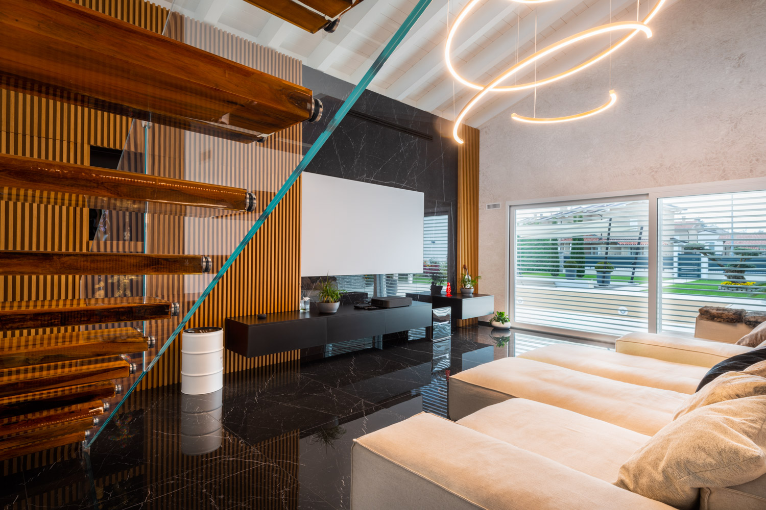 Gli interni sono studiati e disegnati in ogni dettaglio dalle porte a scomparsa alle pareti in legno sino alle maniglie al fine di ricreare un ambiente unico e ricercato in armonia con il progetto degli arredi.