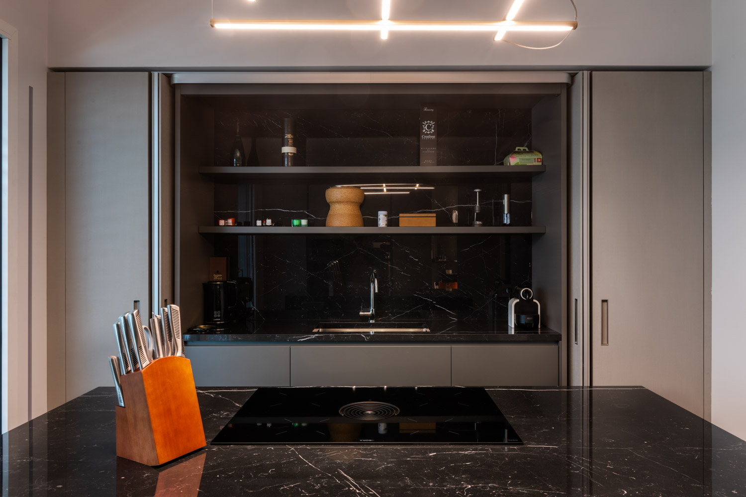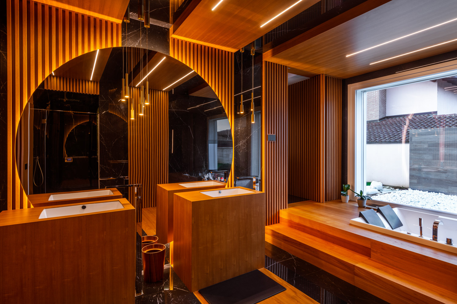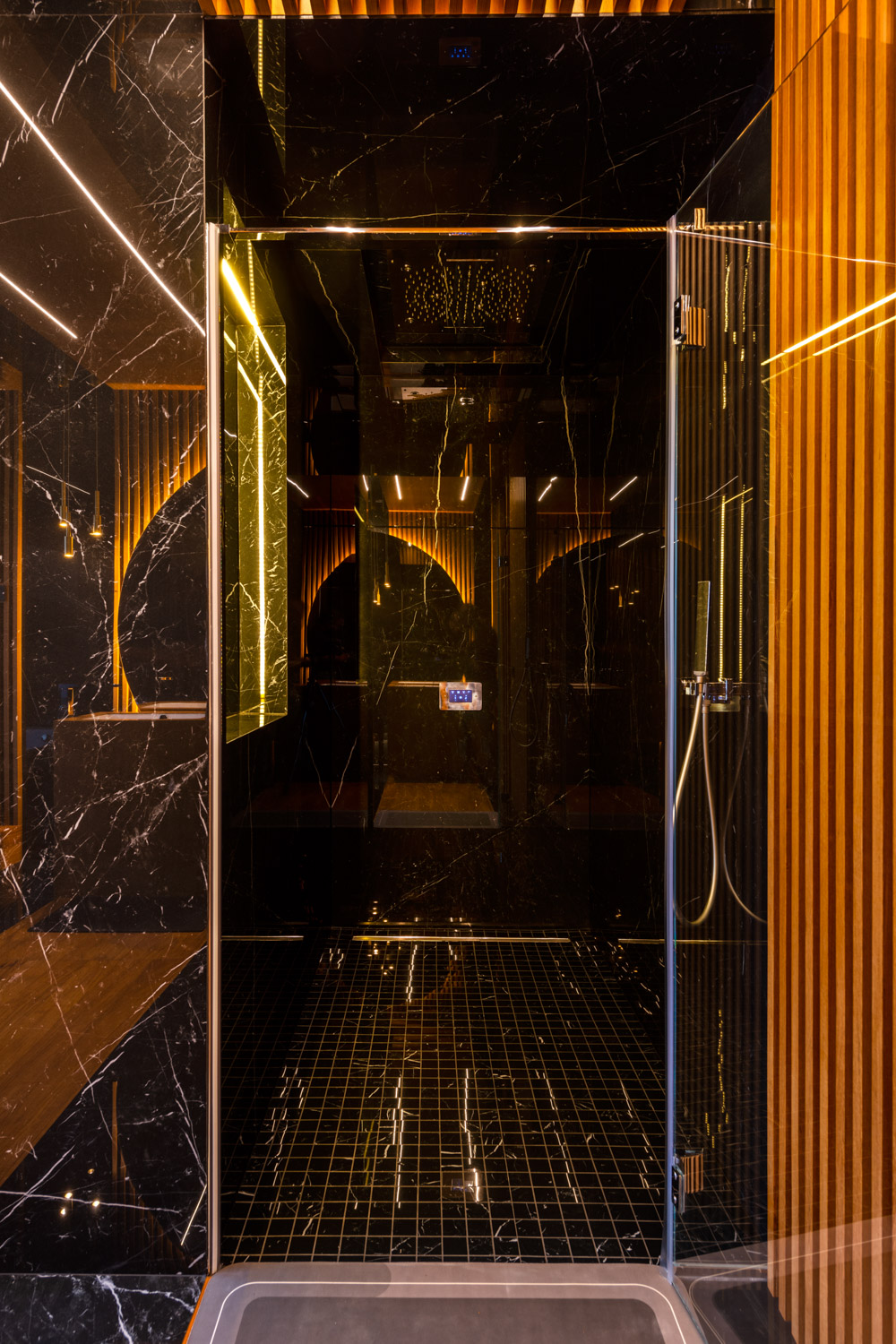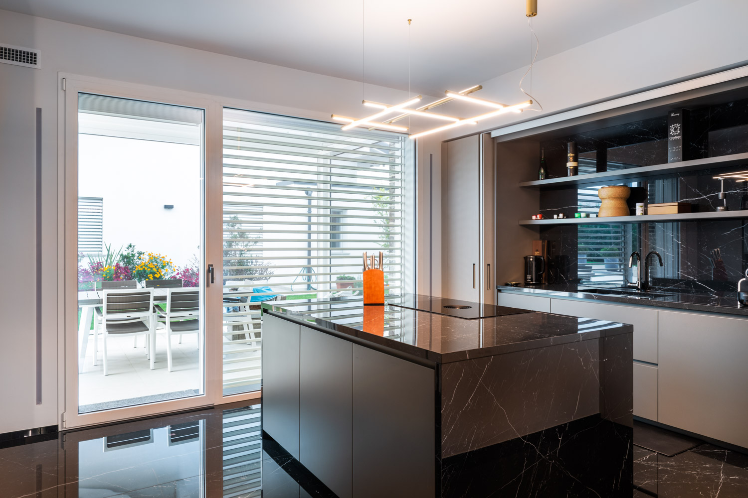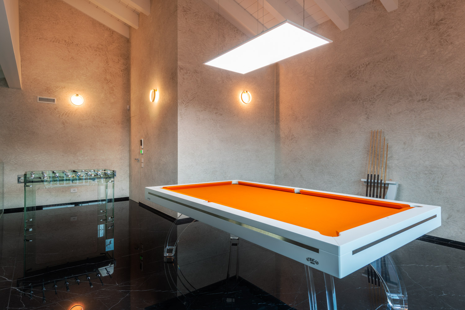 Gli interni sono studiati e disegnati in ogni dettaglio dalle porte a scomparsa alle pareti in legno sino alle maniglie al fine di ricreare un ambiente unico e ricercato in armonia con il progetto degli arredi.