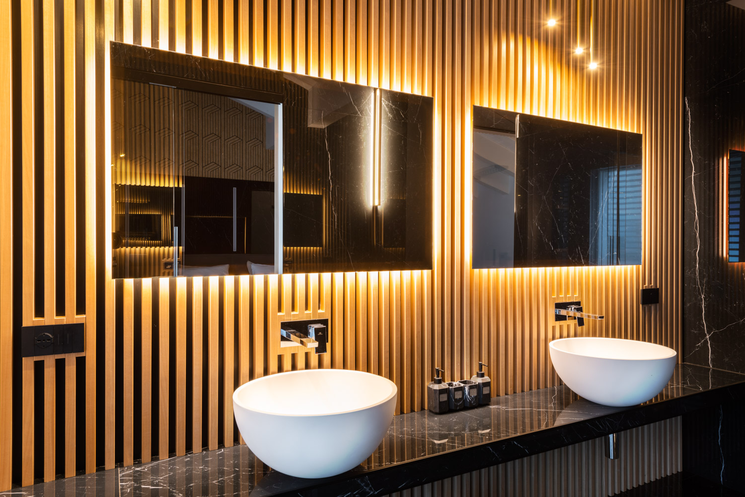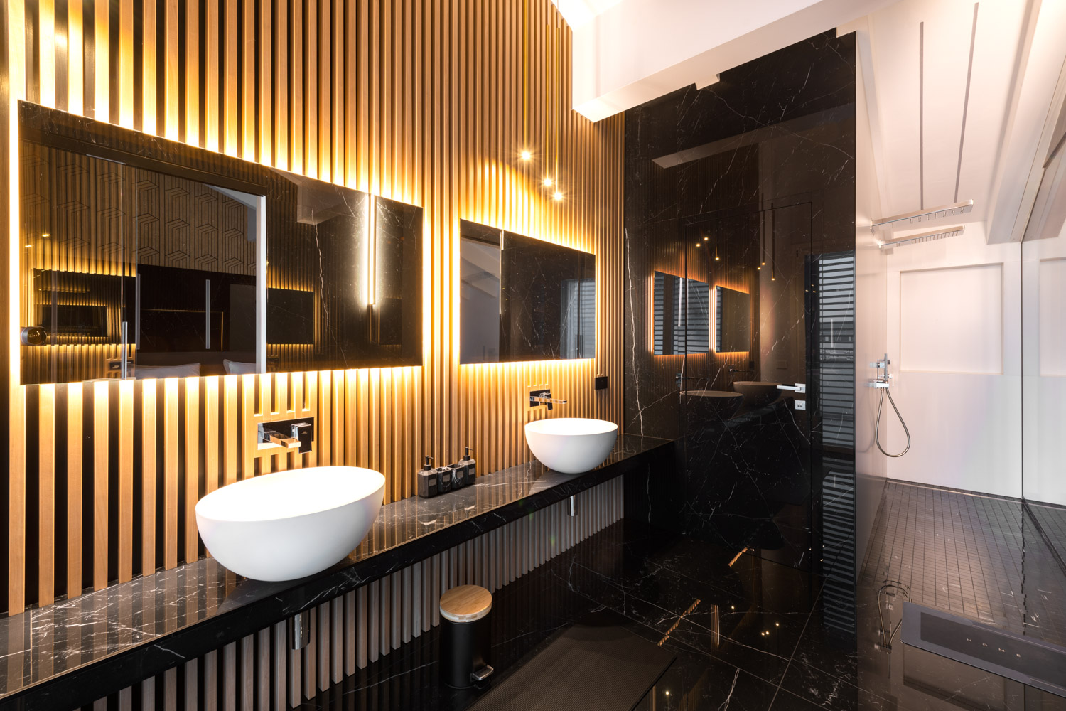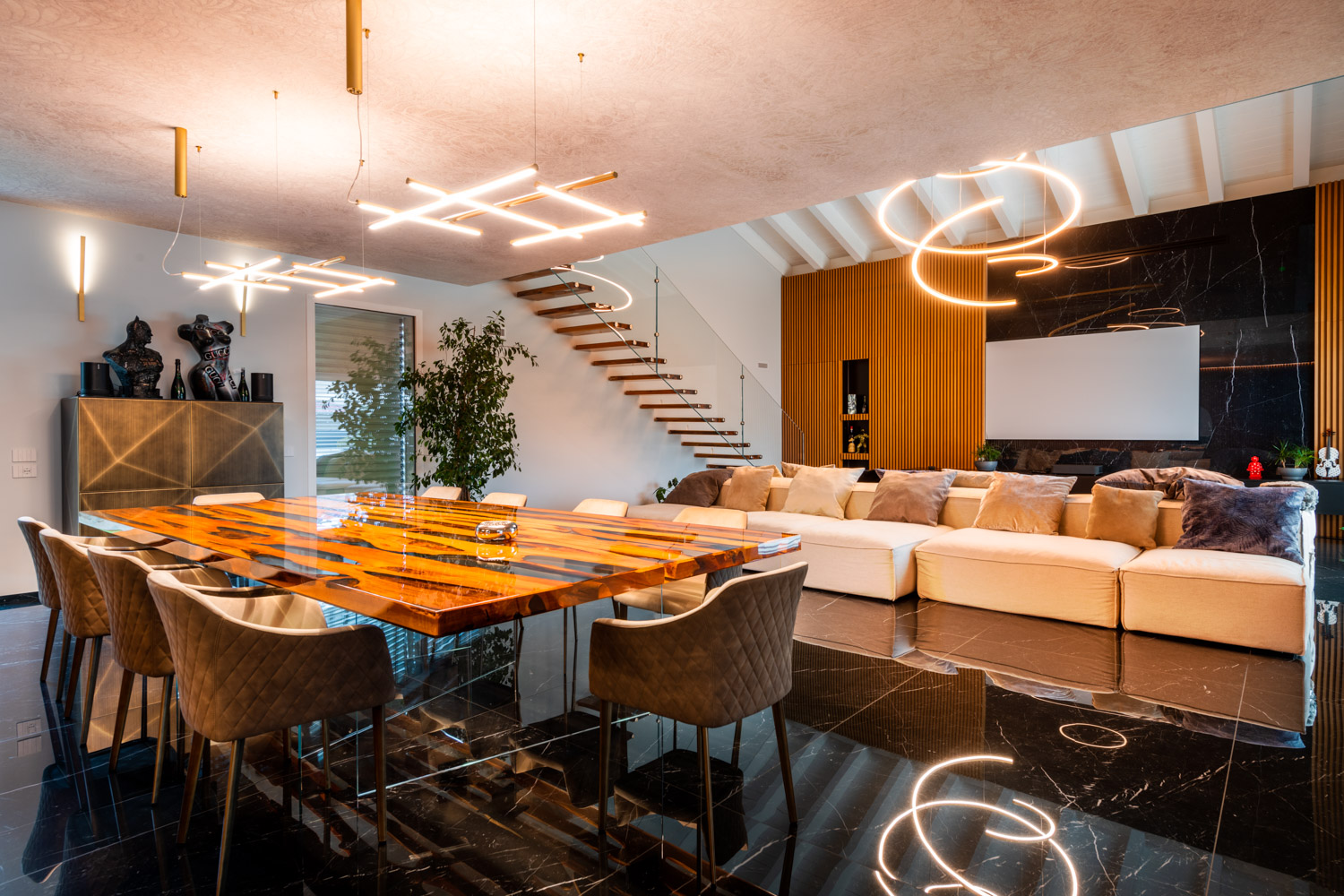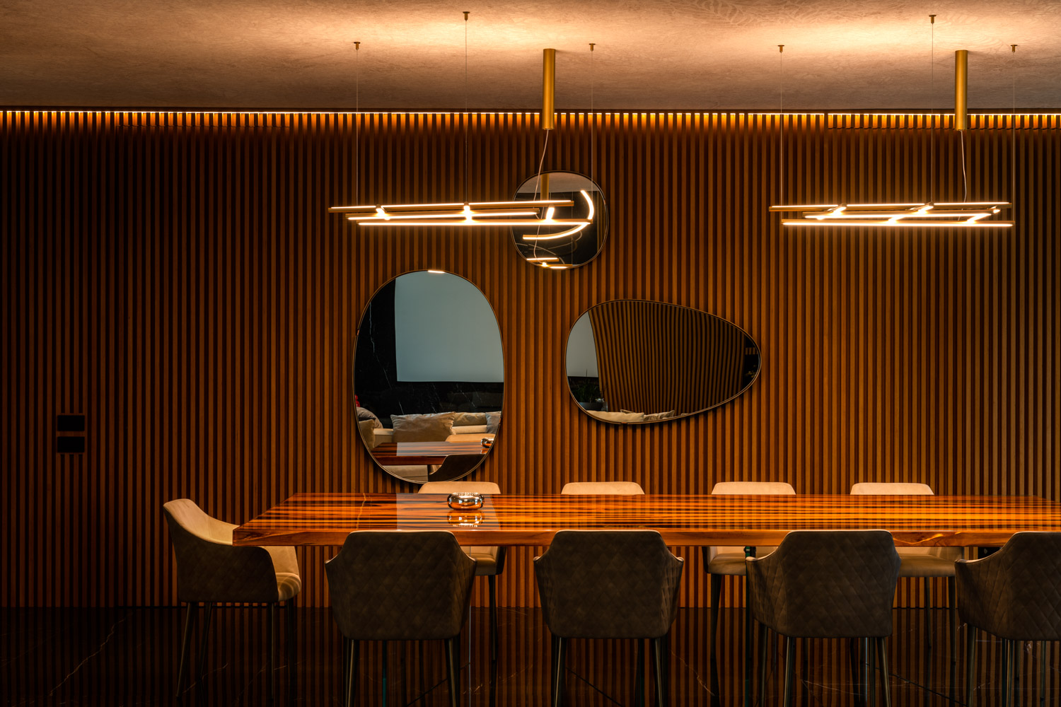Gli interni sono studiati e disegnati in ogni dettaglio dalle porte a scomparsa alle pareti in legno sino alle maniglie al fine di ricreare un ambiente unico e ricercato in armonia con il progetto degli arredi.